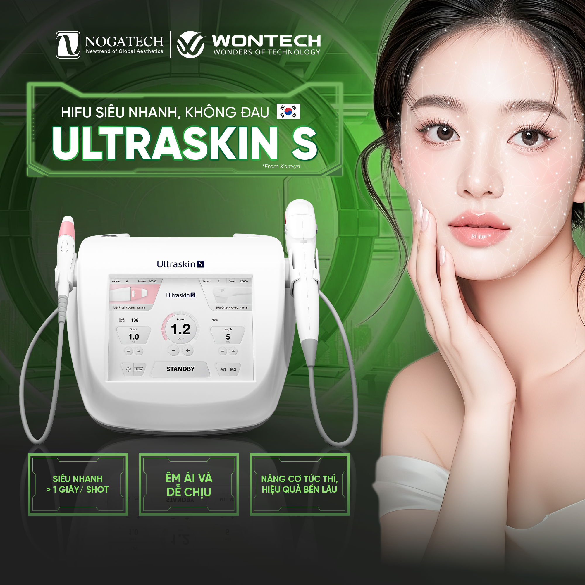 Chứng nhận quốc tế – KFDA/CE; sản phẩm từ Wontech/Wonmedco (Hàn Quốc) – một trong ba nhà sản xuất thiết bị thẩm mỹ lớn tại Hàn Quốc .
